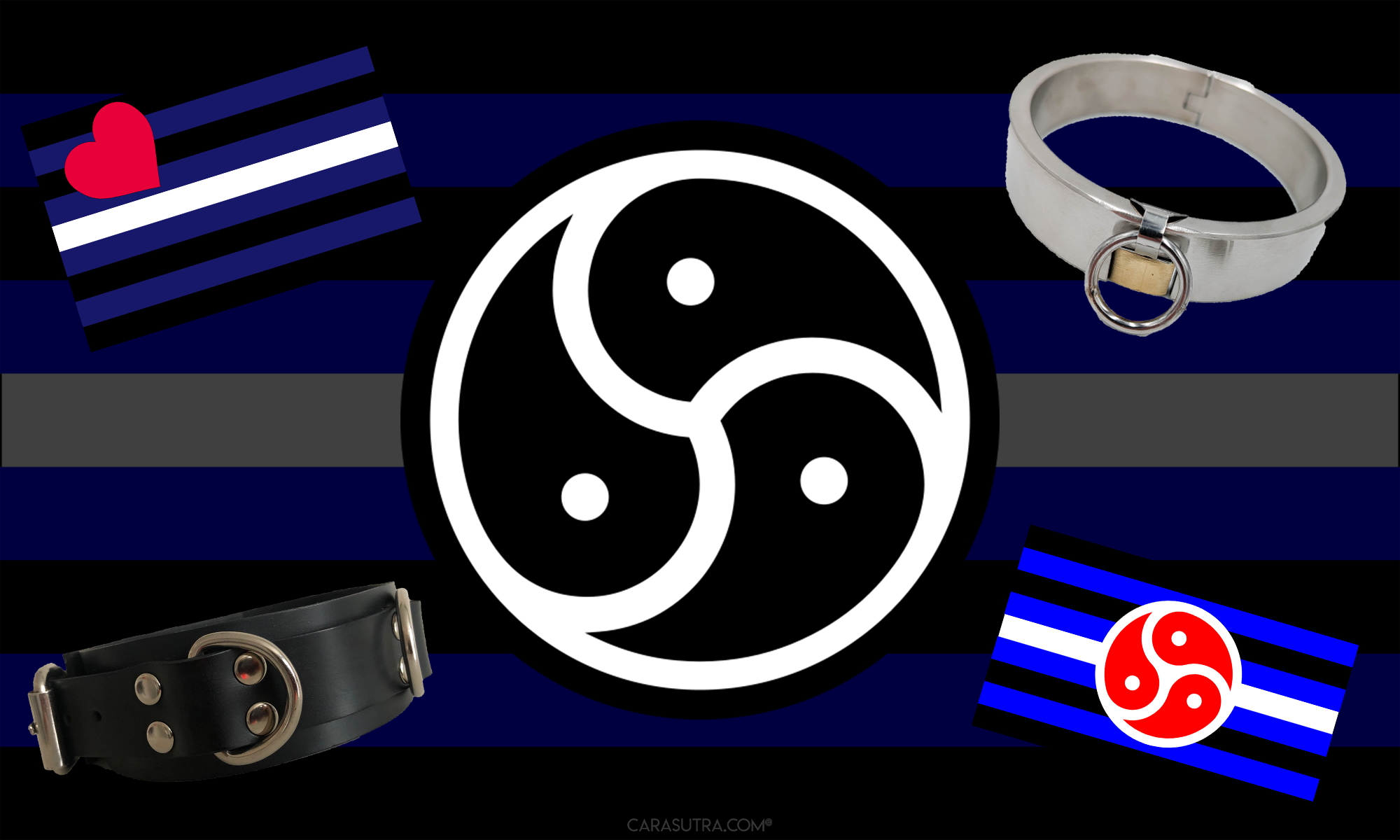 Collars: A collar worn around the neck can symbolise submission, ownership, or commitment within a D/s relationship.- The Leather Pride Flag: Designed in 1989, this flag has black, blue, white stripes and a red heart, and is strongly associated with the leather and BDSM scene.